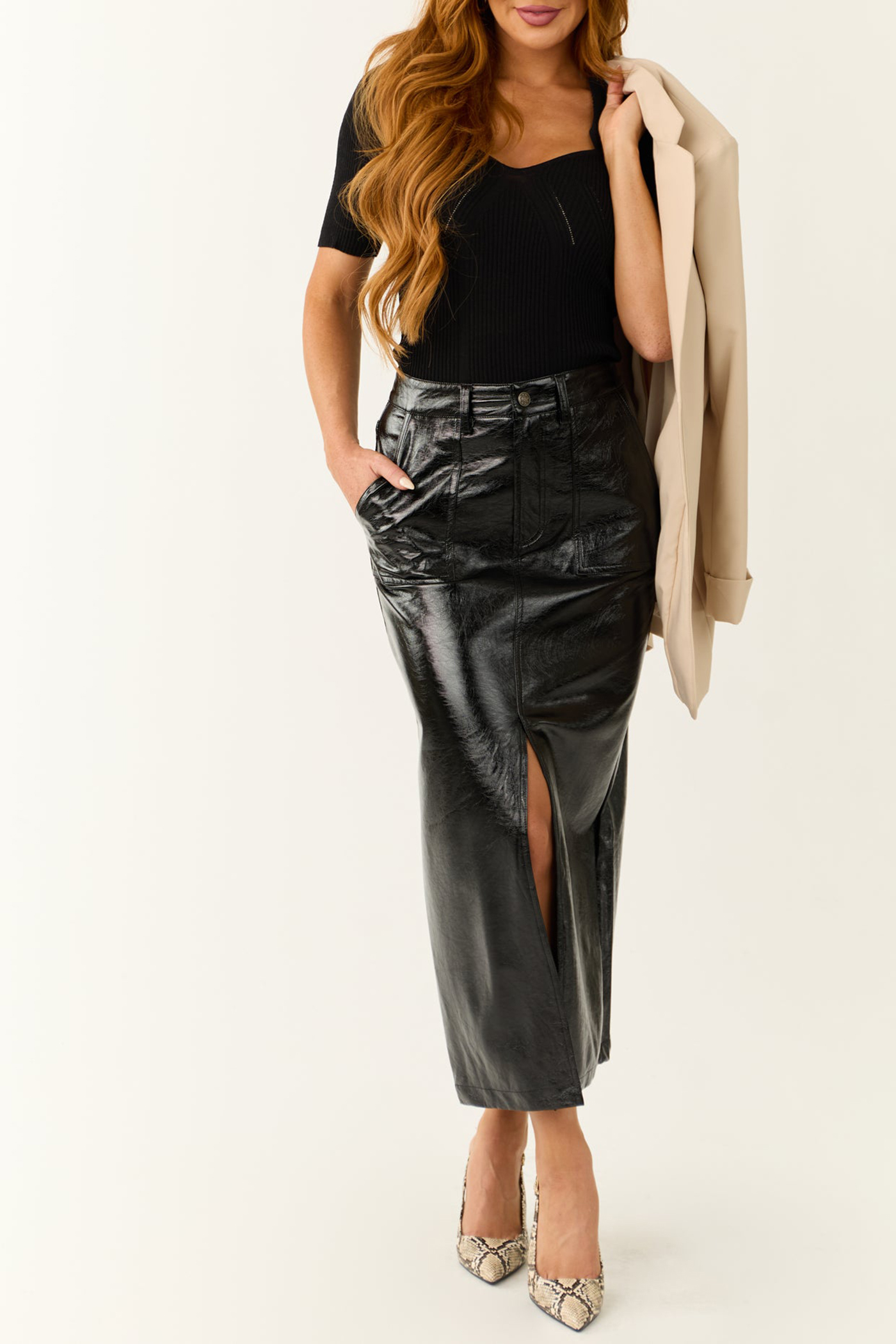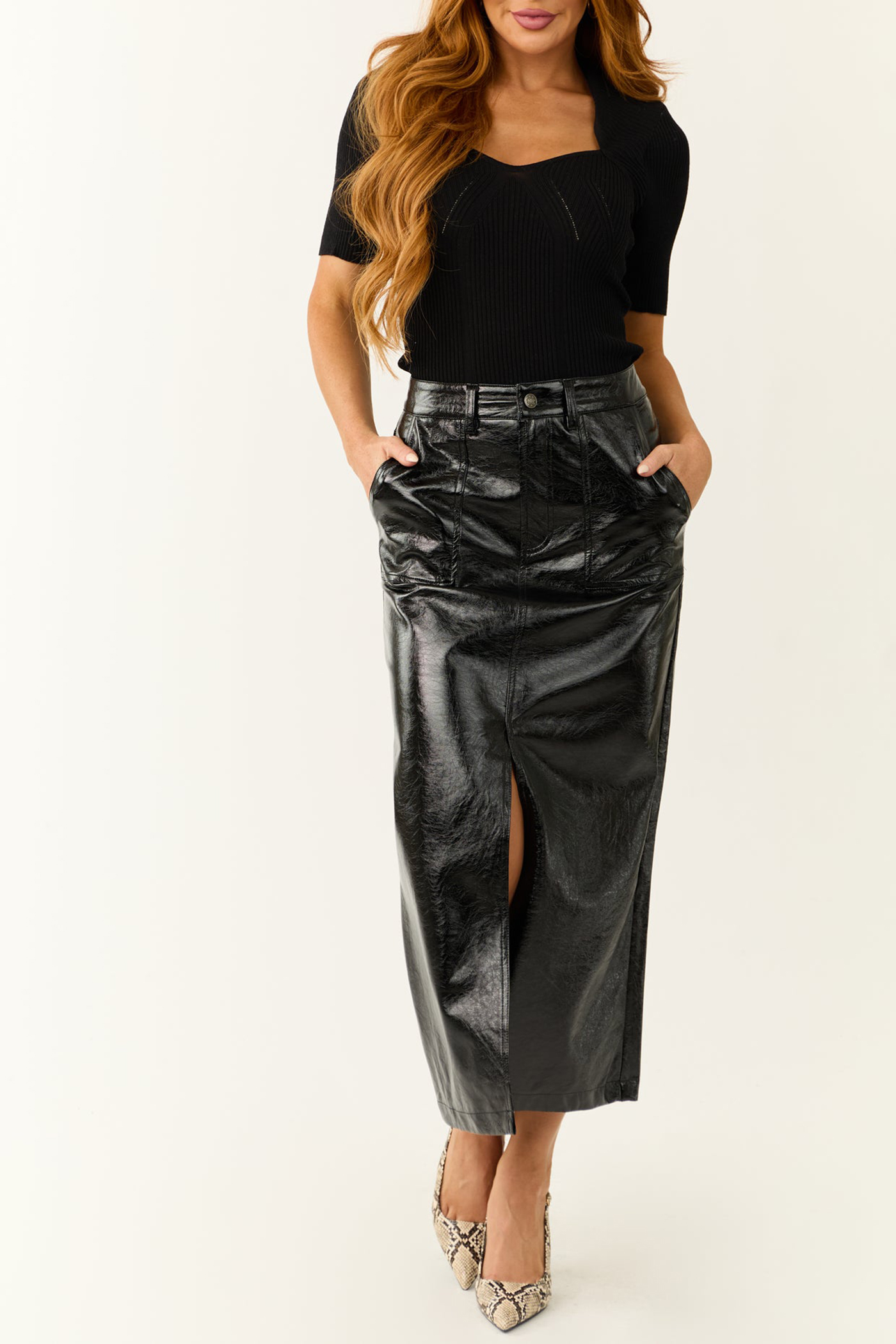 Black Shiny Faux Leather Front Slit Midi Skirt 52388655