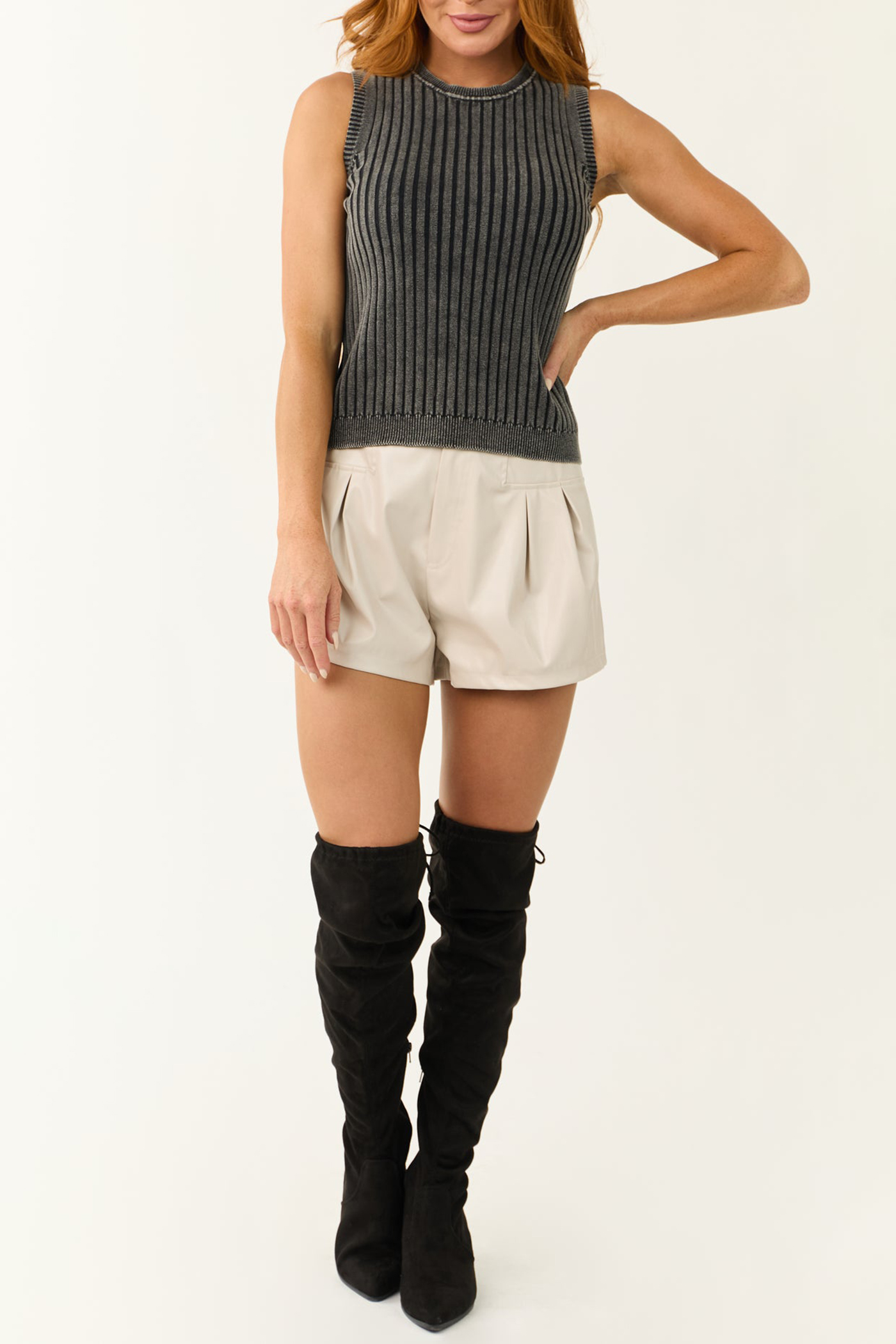 Charcoal Ribbed Knit Sleeveless Fitted Top 52382367