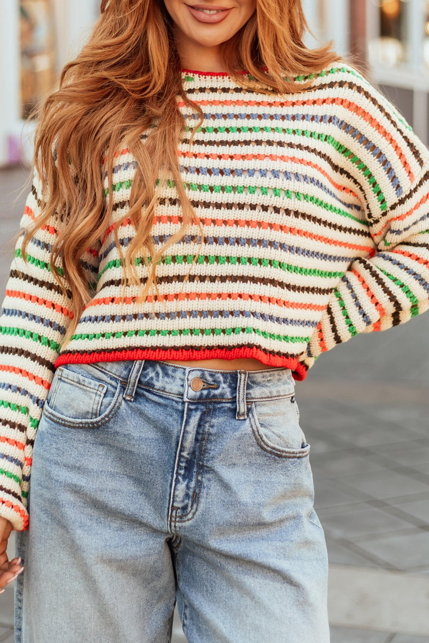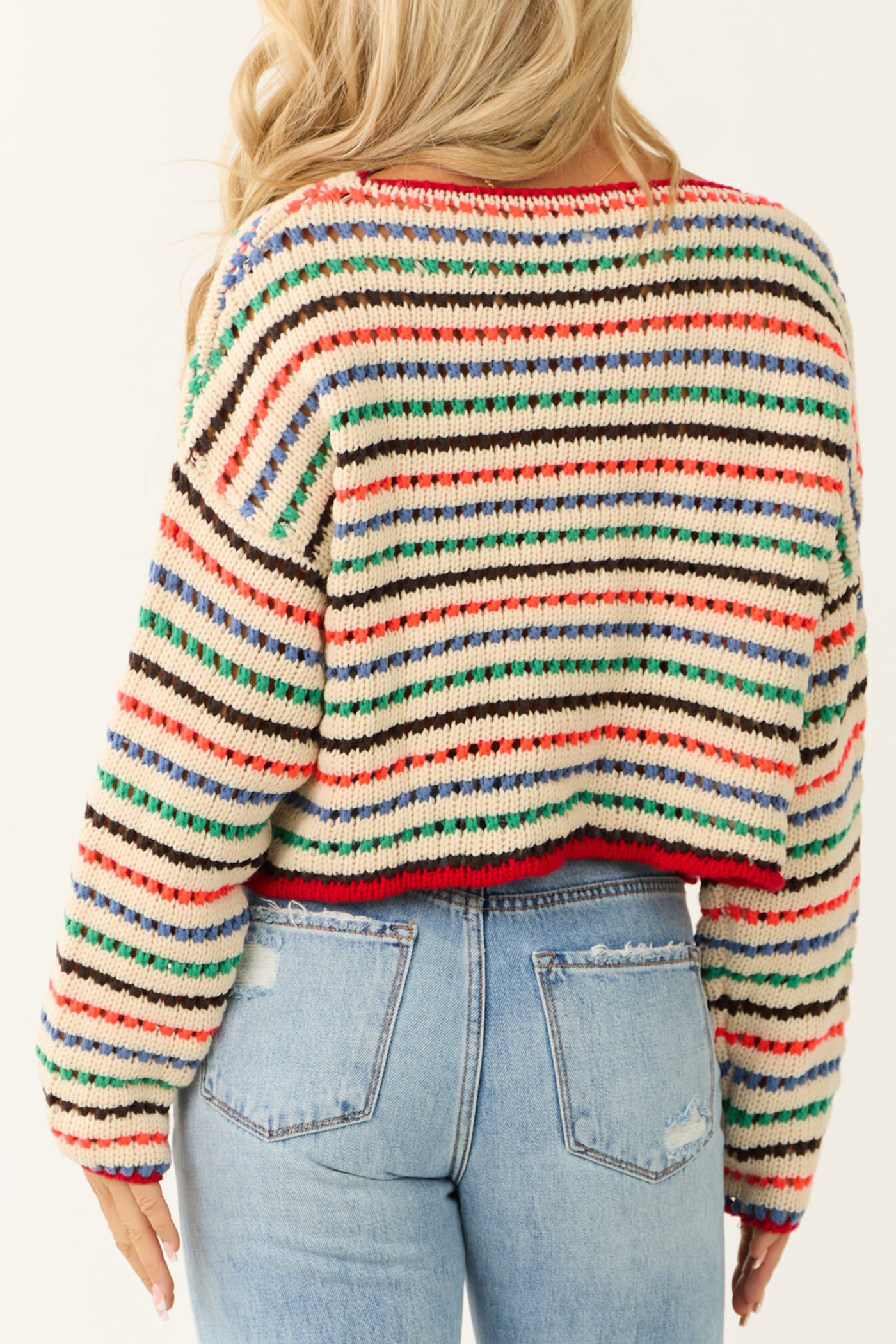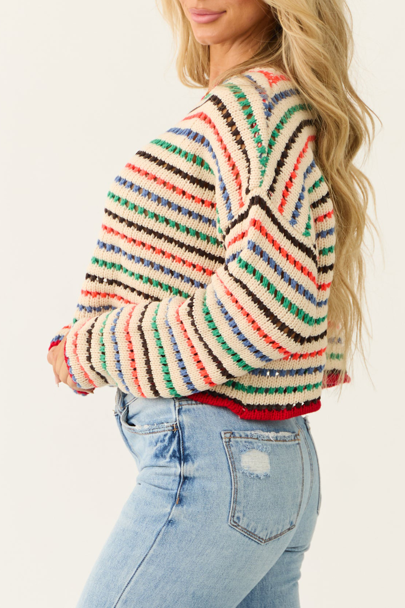 Cream Multicolor Striped Open Crochet Sweater 52388382
