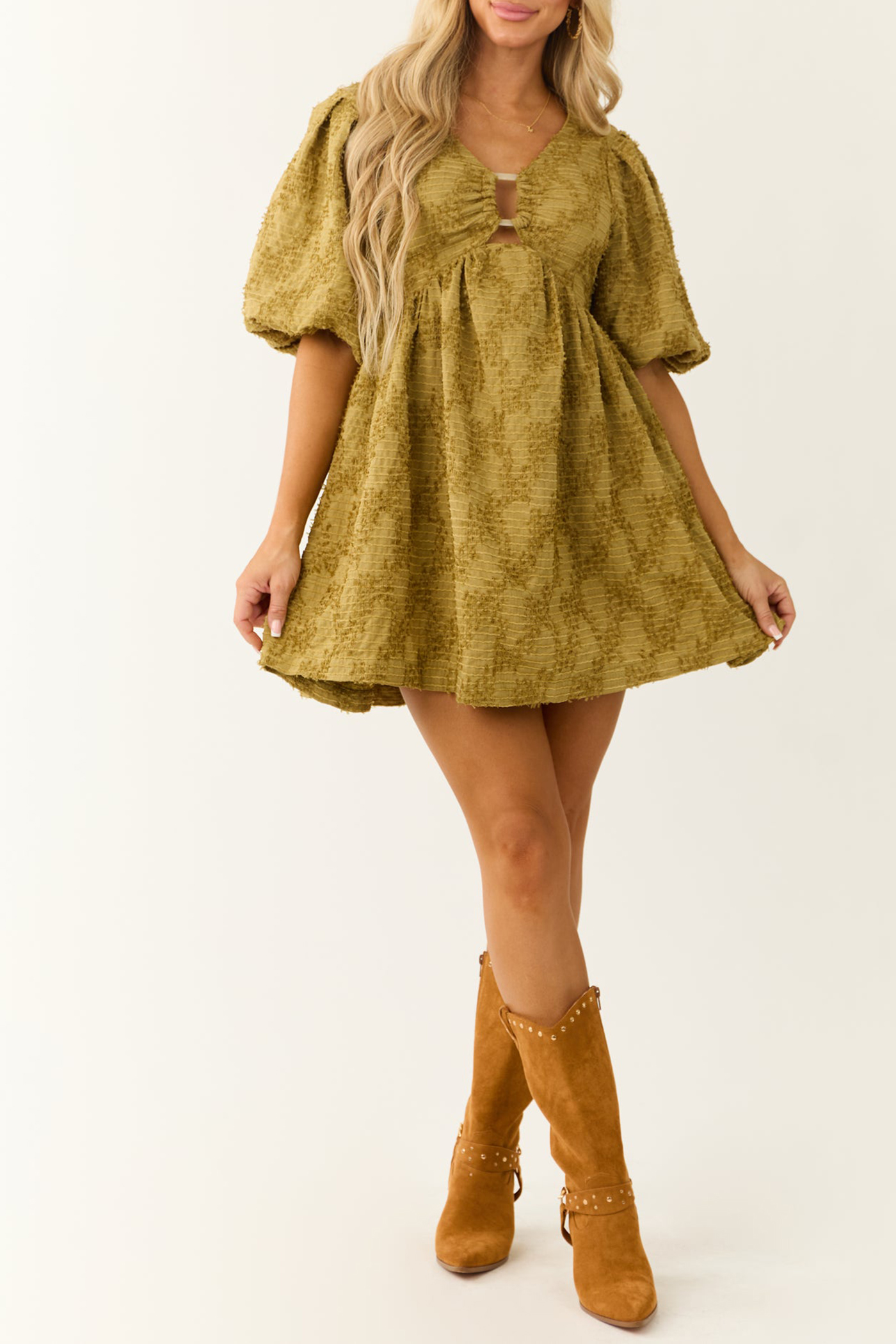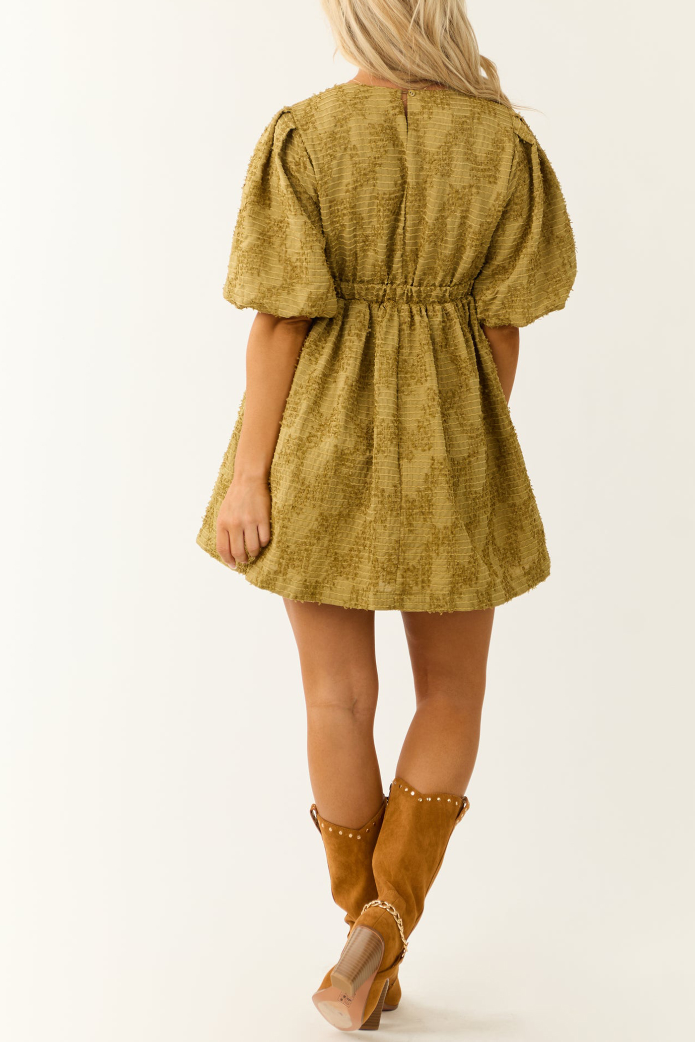 Olive Textured Half Puff Sleeve Mini Dress 52389259